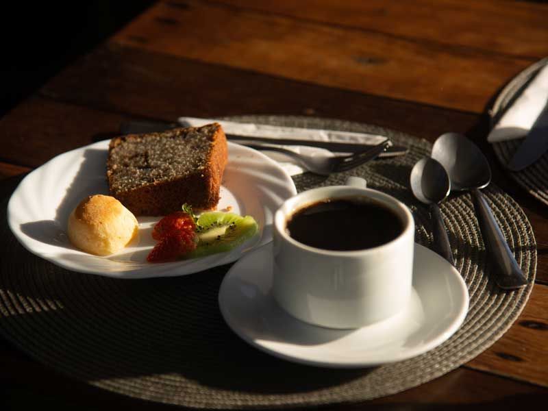Comece o dia com um delicioso café da manhã preparado com todo carinho e com produtos frescos de produção própria servimos uma variedade de pães, bolos, frutas, sucos e outras delicias que vão tornar suas manhãs ainda mais especiais.